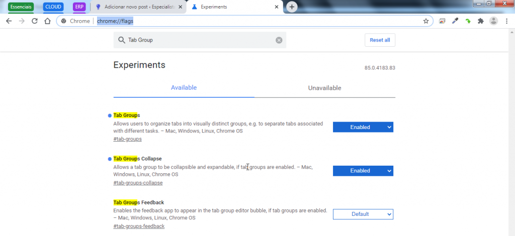 No campo de busca, preencha com TAB Group, vide exemplo abaixo, e mude o Status de “DEFAULT” para “ENABLE”, forçando assim que o recurso seja ativado: